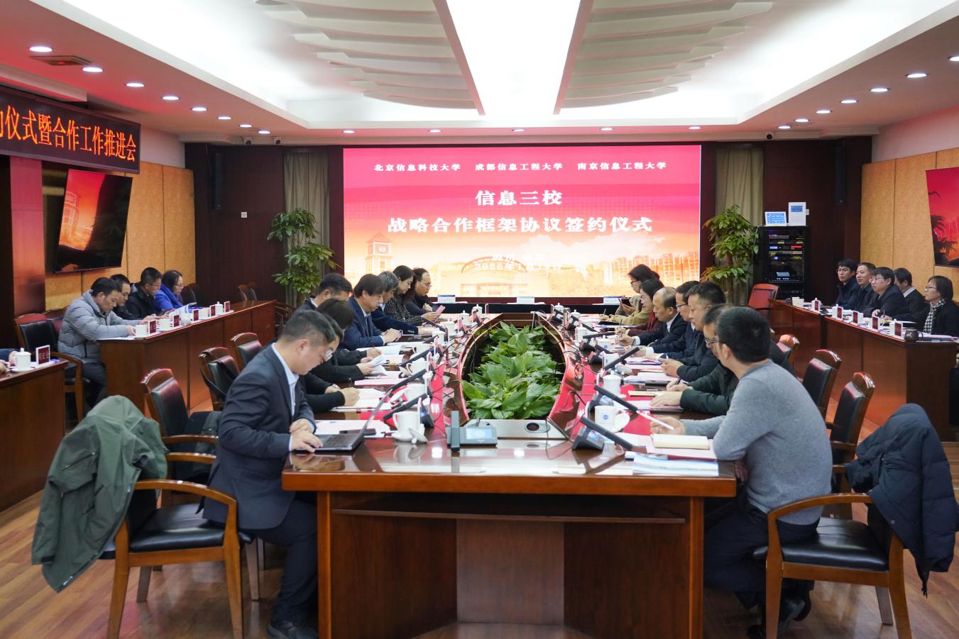 1月19日,北京信息科技大学、成都信息工程大学、南京信息工程大学“信息三校”战略合作框架协议签约仪式暨合作工作推进会在我校航空港校区举行。北京信息科技大学校长郭福、副校长张健,南京信息工程大学校长陈海山、副校长刘佳,我校党委书记沈火明、校长何建新、副校长罗小蓉出席签约仪式。会议由我校副校长舒红平主持。